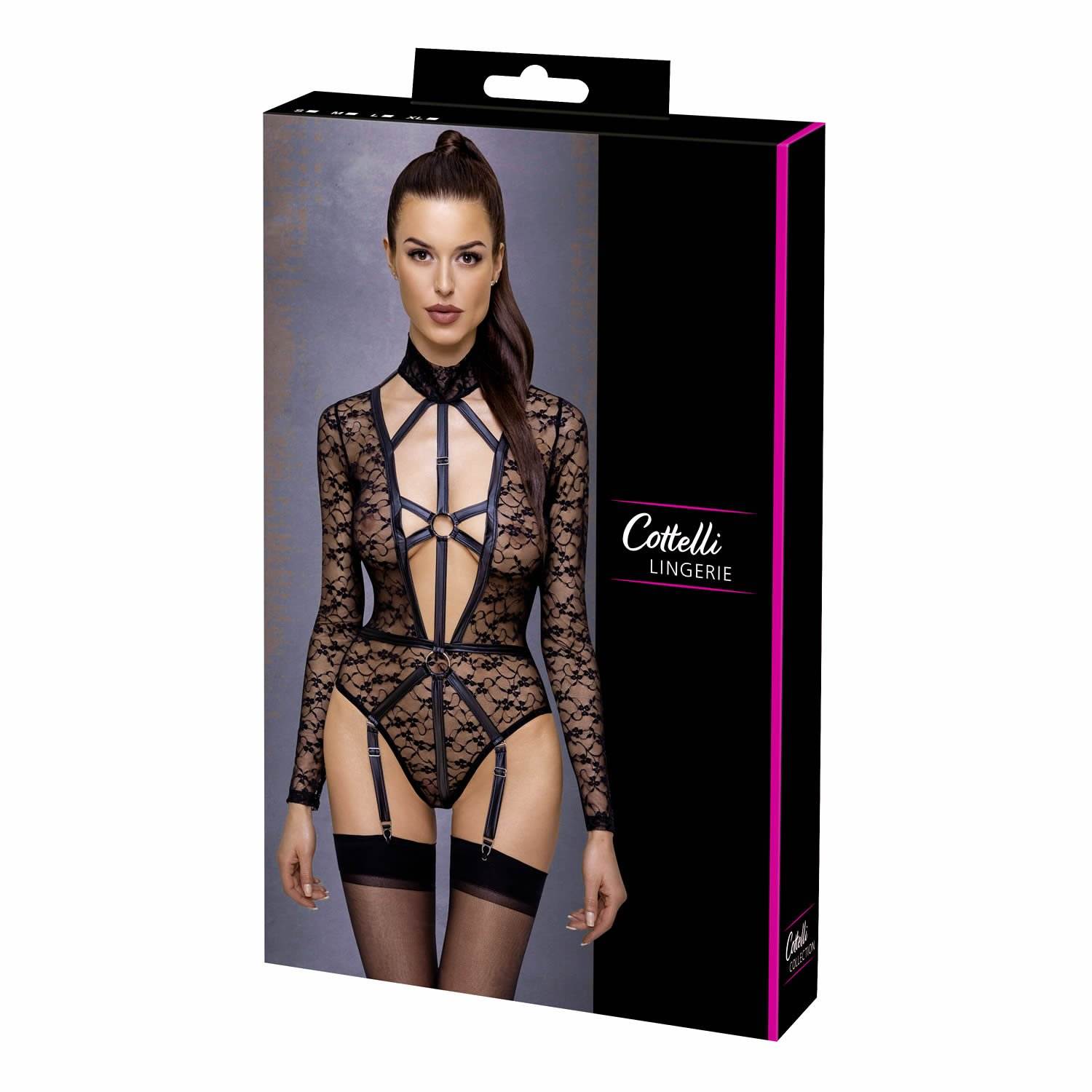 Langærmet bodystocking fra Cottelli LINGERIE helt fremstillet af fine bløde blonder med raffinerede detaljer i mat look. Elastisk over det hele og blødt blødt for en tæt pasform med højeste bærekomfort. Lavt udskåret til navlen foran og i et provokerende selelook med stretchbånd og ringe. Dekorative strækbånd holder også alt sammen i den generøse halsudskæring bagpå. Den høje blondekrave lukkes med 2 knapper i nakken. Trykknaplukning i skridtet. Selerne er justerbare og kan også fjernes helt. 90% polyamid, 10% spandex.
