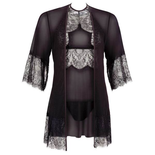 Den passende sorte kimono med halvlange ærmer smyger sig til kroppen og fremhæver dine perfekte kurver.