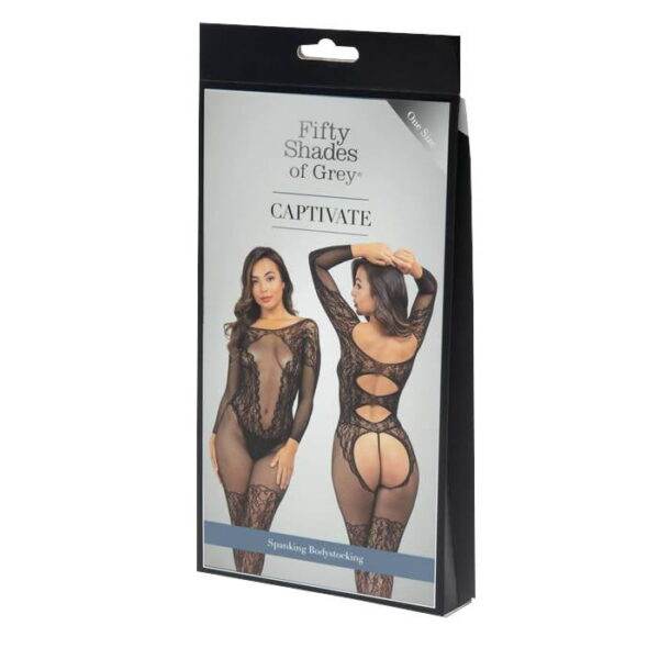 Long sleeve net catsuit Captivate from Fifty Shades of Grey that has a body and stockings in a lace design woven into it. It is very soft and stretchy for a comfortable fit. The front has a plunging neckline and there are exciting cut-outs at the back. The catsuit is completely crotchless and has a foot part. 93% polyamide, 7% spandex.There is a separate size chart for Fifty Shades of Grey. String not included.
