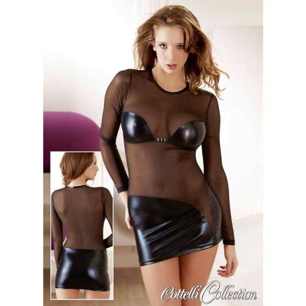 This black minidress plays with cuts and fabrics. Opaque wetlook bra and bottom details and the rest is sheer translucency. Gemstone details trim the front. Clean cut with long sleeves. Black. 60% polyamide, 30% polyester, 10% elastane.