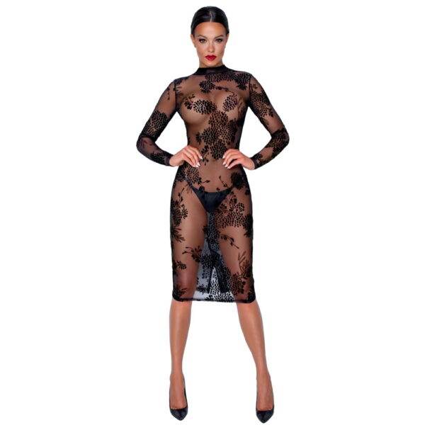 Med denne forførende langærmede kjole pakker du dine fantastiske kurver i det fineste powernet og dekorerer det med et delikat blomsterfløjlsprint. Takket være det elastiske materiale og spalten kan du bevæge dig rundt uden besvær og nyde den sarte gennemsigtighed på din hud rundt omkring. Du kan enten vælge ikke at bære noget nedenunder, eller tage valget at have en body eller bh nedenunder som også ser overvældende ud!