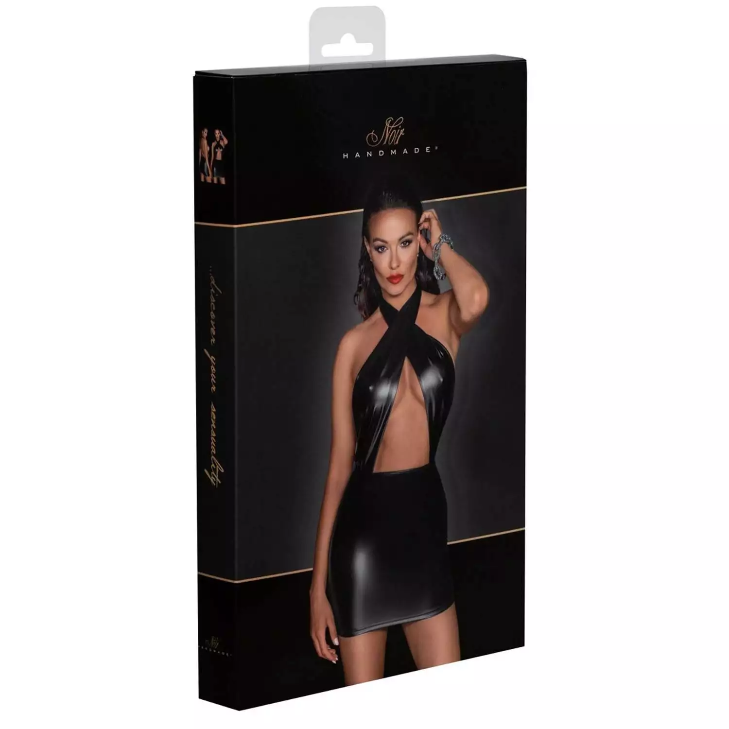 Denne spændende lille wetlook kjole viser dine kurver perfekt i en figursyet korset stil med søde og elegante plissering samt åben front!