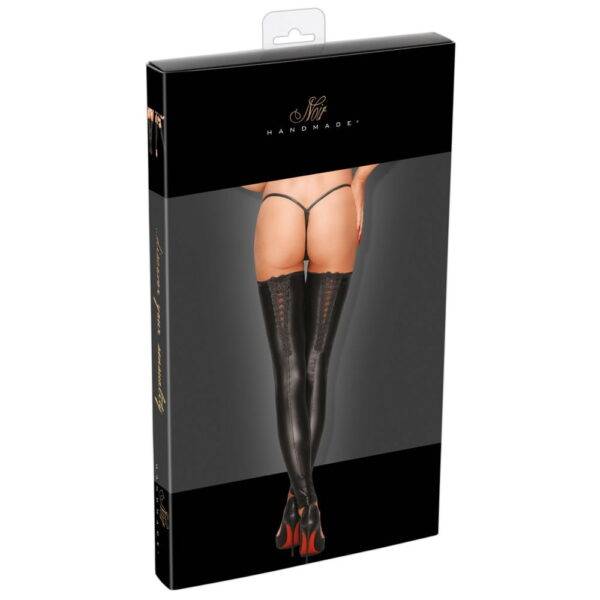 Very stretchy (power) wetlook in a shiny matte black look. Footless stockings lined with silicone for a perfect non-slip fit. With embroidery at the back in a lacing design. 90% polyamide, 20% elastane. Without string. IMPORTANT: there is a separate size chart for NOIR!