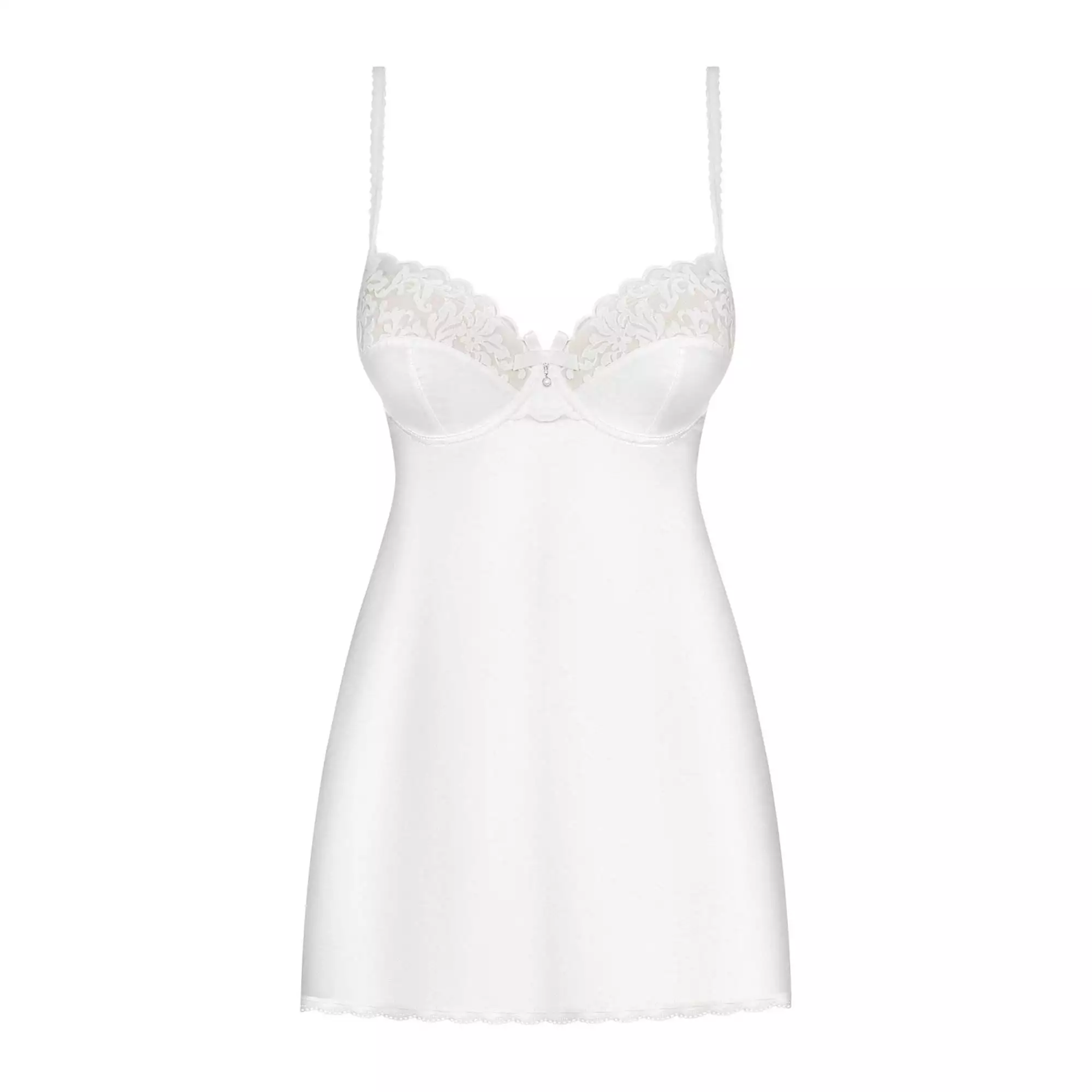 860-SET-2 fra Obsessive med bøjle-bh og g-streng af fine hvide blomsterblonder. Blød og elastisk over det hele for høj komfort. Bøjle-bh med skålstropper og smykkedetalje. De justerbare dobbelte stropper krydses på ryggen. Stringens sofistikerede snit med stropper i taljen og dekorative detaljer fremhæver hofter og bagdel på en forførende måde.