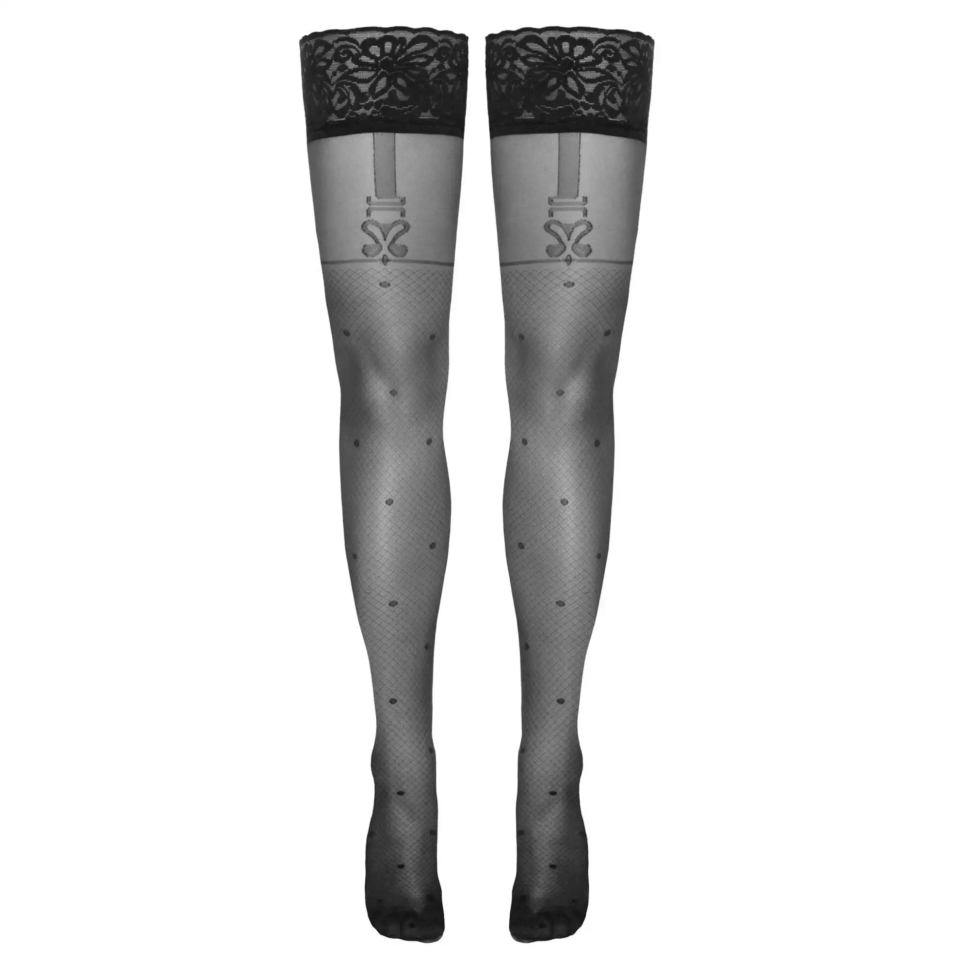 Disse fine sorte strømper med deres legesyge prikkede look giver silkeagtig lethed på dine ben. Prikkerne står elegant på linje hele vejen rundt om dine lår og som en bagsøm. Silikoneforstærkningen i den smukke blondekant sikrer en skridsikker pasform. Så strømperne holder perfekt ved alle dine optrædener. Nyd den sensuelle silkeagtige fornemmelse og de beundrende blikke!